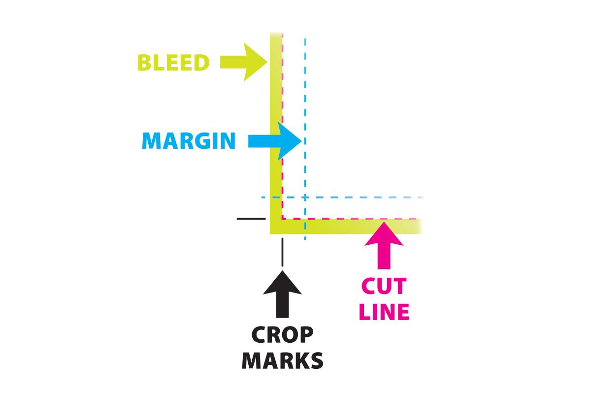 Bleed allows us to print your document and trim it down to the correct dimensions without a white border, unless you require it. Margins keep your important information safe. We accept bleed between 3 - 5 mm. Crop marks are usually added during the export operation. They must be added regardless of your file.