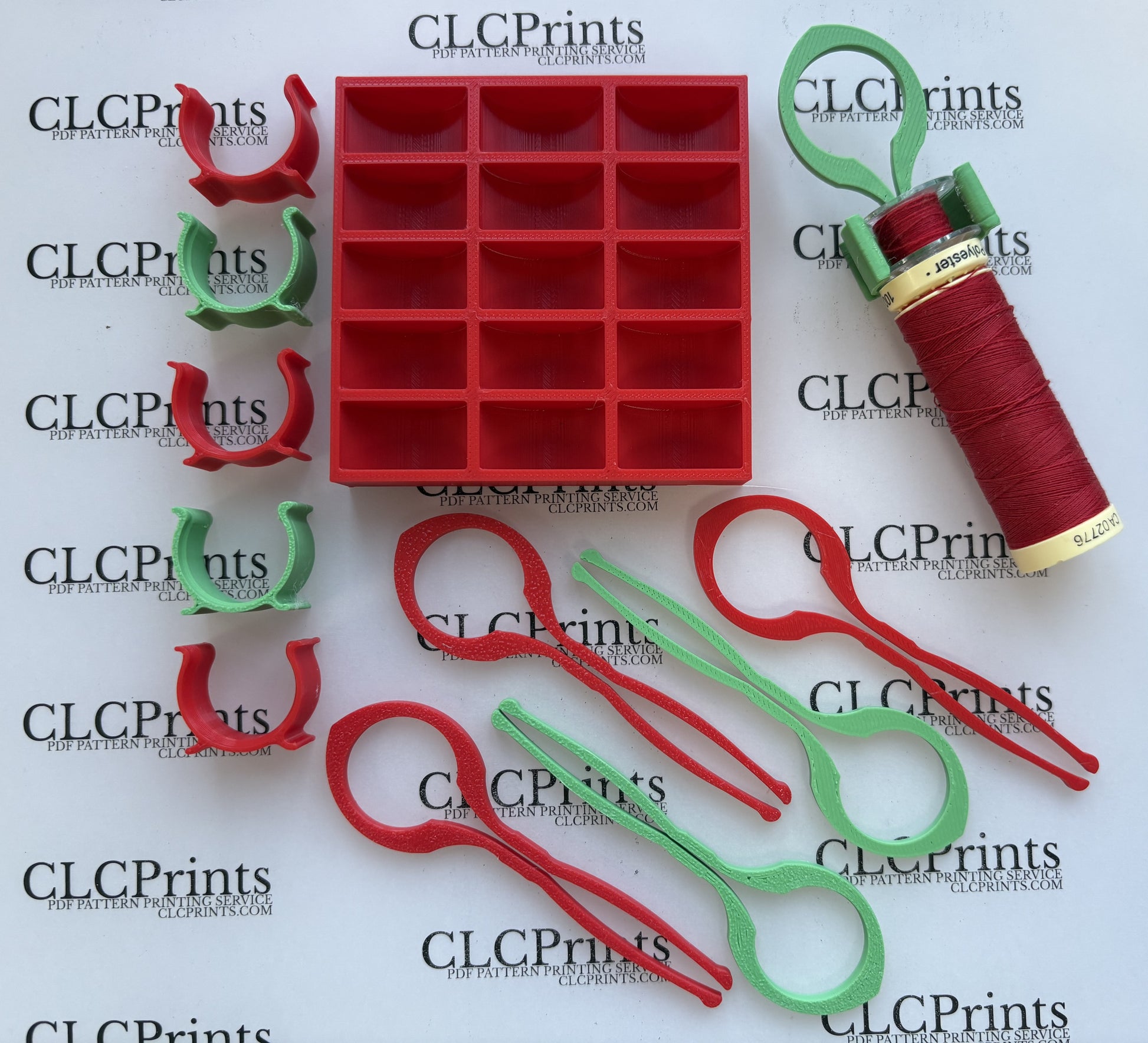 - Travel 3D Printed Gift Set contains - 1 x Desk bobbin tray, 6 x travel bobbin and thread holders and 6 x bobbin clips.