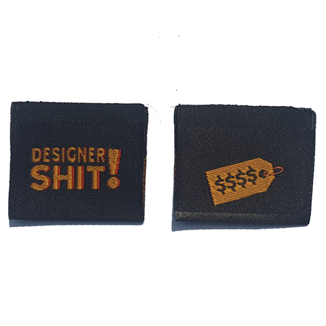 These are woven black woven labels with 'DESDIGNER SHIT!' on the front and a hang tag symbol on the back.
