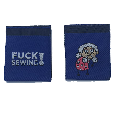 There are woven royal blue label on one side is 'FUCK SEWING!' and on the other side is an image of a granny.
