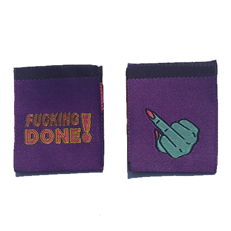 There are woven purple labels with 'FUCKING DONE!' on the front and hand with middle finger up on the back.