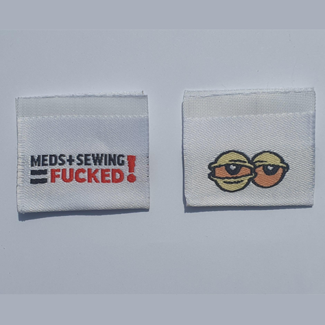 These are woven white labels with 'meds + sewing = fucked! on the front and eyes on the back.