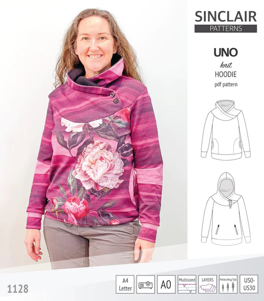 Featuring: semi fitted at the shoulders and bust, fitted at the hips (with the bottom band) hoodie designed for knit fabrics. Comes in a low hip length. Offered with a roomy lined or non lined (finished with a facing) overlapped cowl or a hood finished with optional drawstrings. Cowl and Hood are designed to be a part of the round accent yoke. Sleeves are finished with fitted cuffs. Can be finished with one layer side pockets or with zippered pockets.