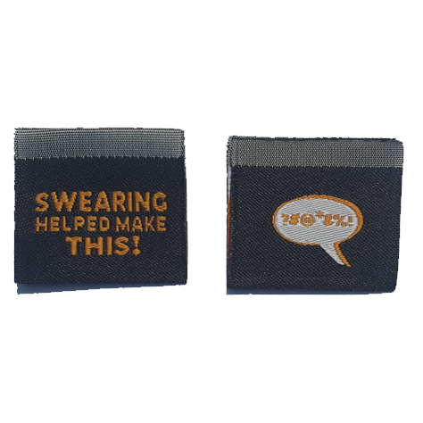 These are woven black labels with 'Swearing helped me make this' on the front and a speech bubble with '?#@*&%!' on the back