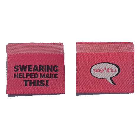 These are woven pink labels with 'Swearing helped me make this' on the front and a speech bubble with '?#@*&%!' on the back