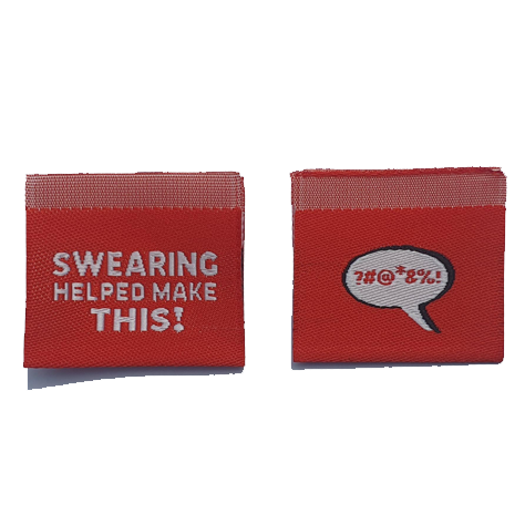 These are woven red labels with 'Swearing helped me make this' on the front and a speech bubble with '?#@*&%!' on the back